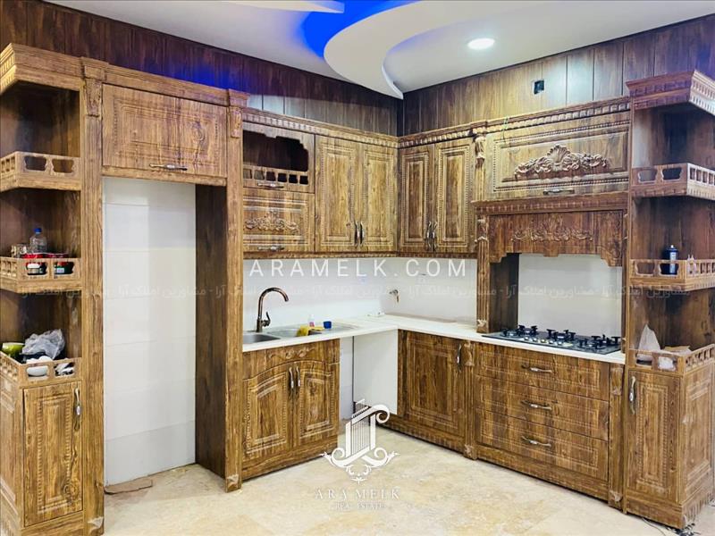 - سالن پذیرایی ، آشپزخانه مجهز با کابینت های ممبران ، گاز رومیزی و هود لمسی